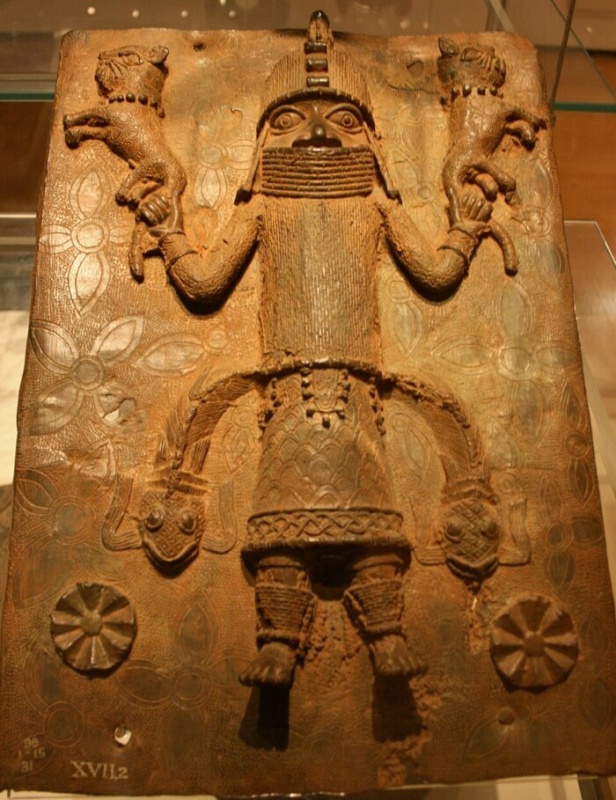 Benini rázplakett (kb. 16–17. század), amely oba törzsi leopárdáldozatot ábrázol. 1897-ben zsákmányolták, ma a British Museumban található (fotó: Wikimedia Commons via Città Nuova)